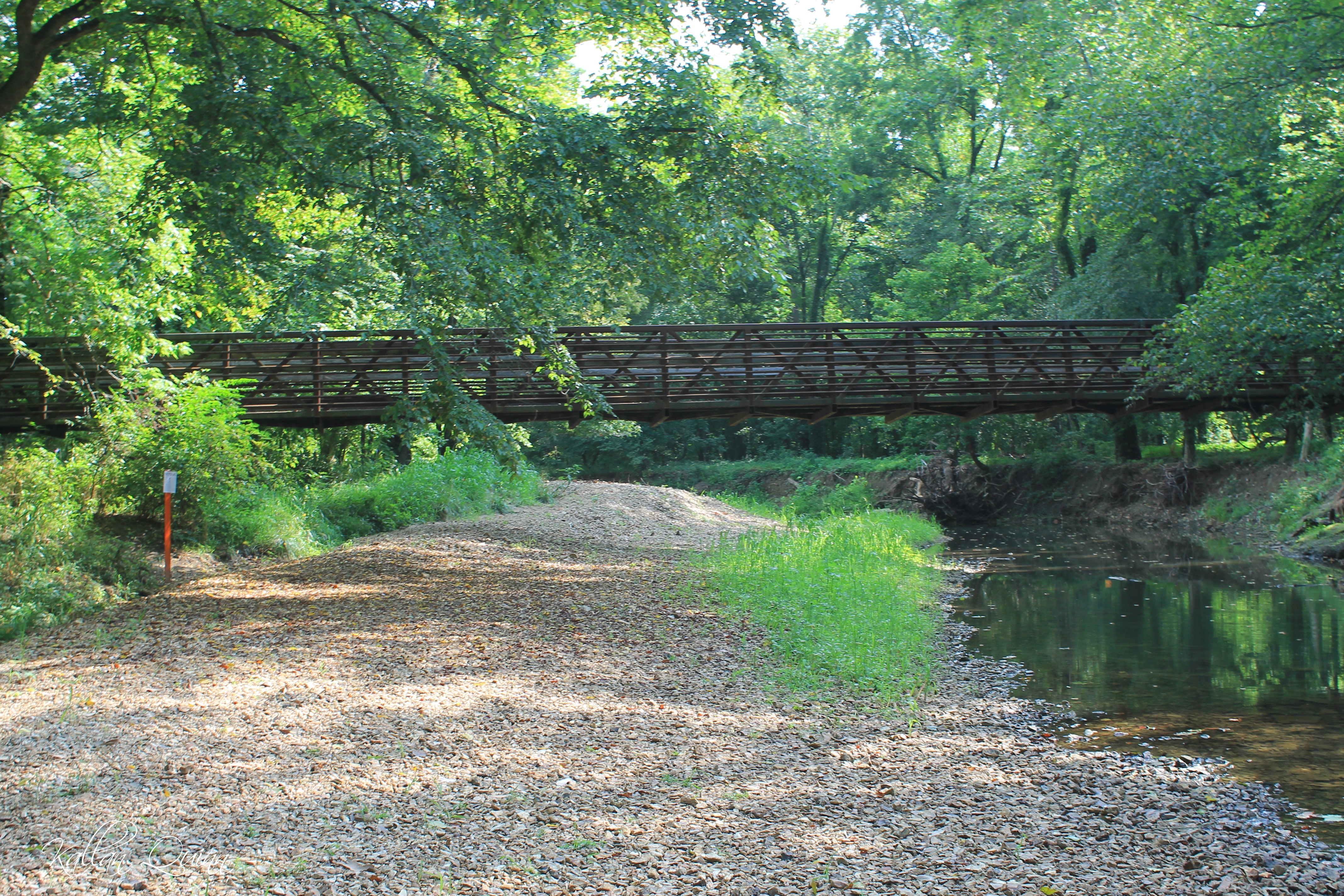 This is a really beautiful trail with stream crossings and wooded areas. There is a bridge that crosses Little Bonne Femme Creek, but while we were there, it was closed due to damage from recent flooding.