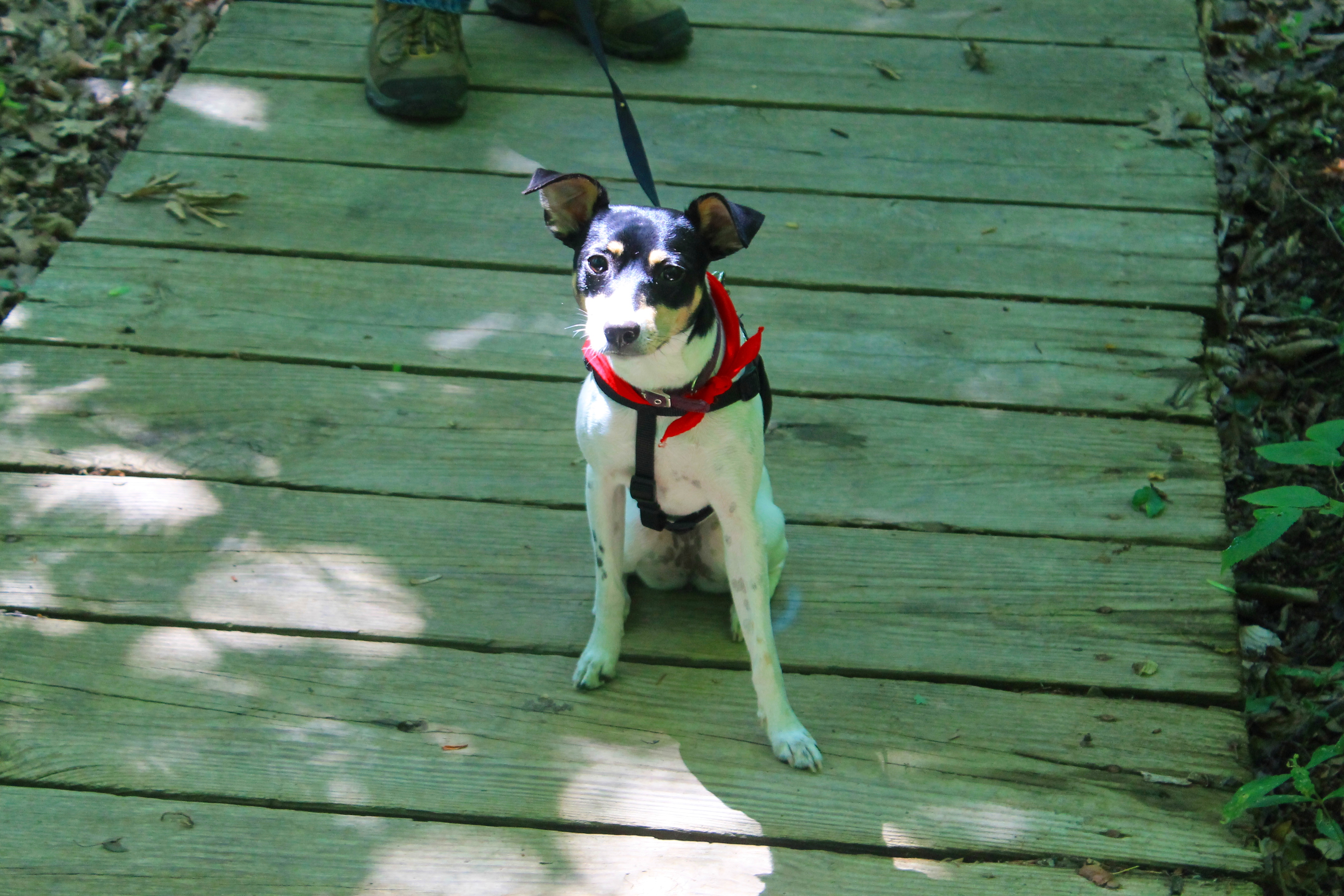 So side note for a little story. There are some small trails that lead down the side of the hill and onto rocks so you can explore the river and waterfalls a bit. We were trying to get a bit closer to the waterfalls for a good picture and my husband looks back and he had accidentally stepped on a hive and ground hornets were swarming our dog. She got stung several times hence the sad puppy picture below. So this was not such a great start to our vacation, but after carrying her a bit, she was ready to go explore again.