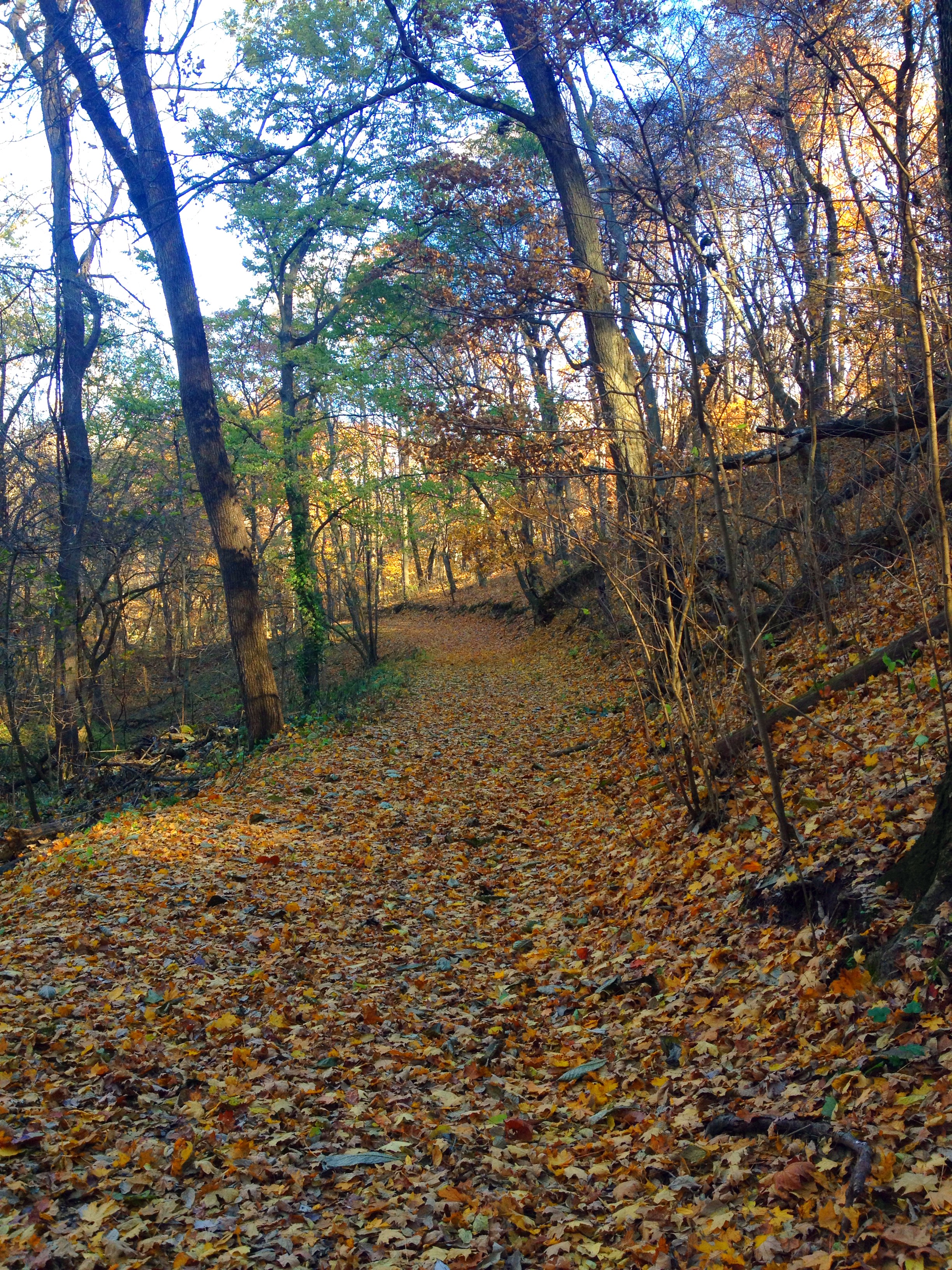 From here, we walked back down to the parking lot and to the left of the overlook trail is the trail head for the Harpst Trail, blazed in yellow. The total length of this trail is .7 miles, however after a short hike through the woods, it meets up with the paved Bicycle Trail. We took this trail to the right as it followed along the hills and gullies of Harpst Valley. The leaves had already changed into vibrant golds and oranges and the trees were dropping their leaves quickly.