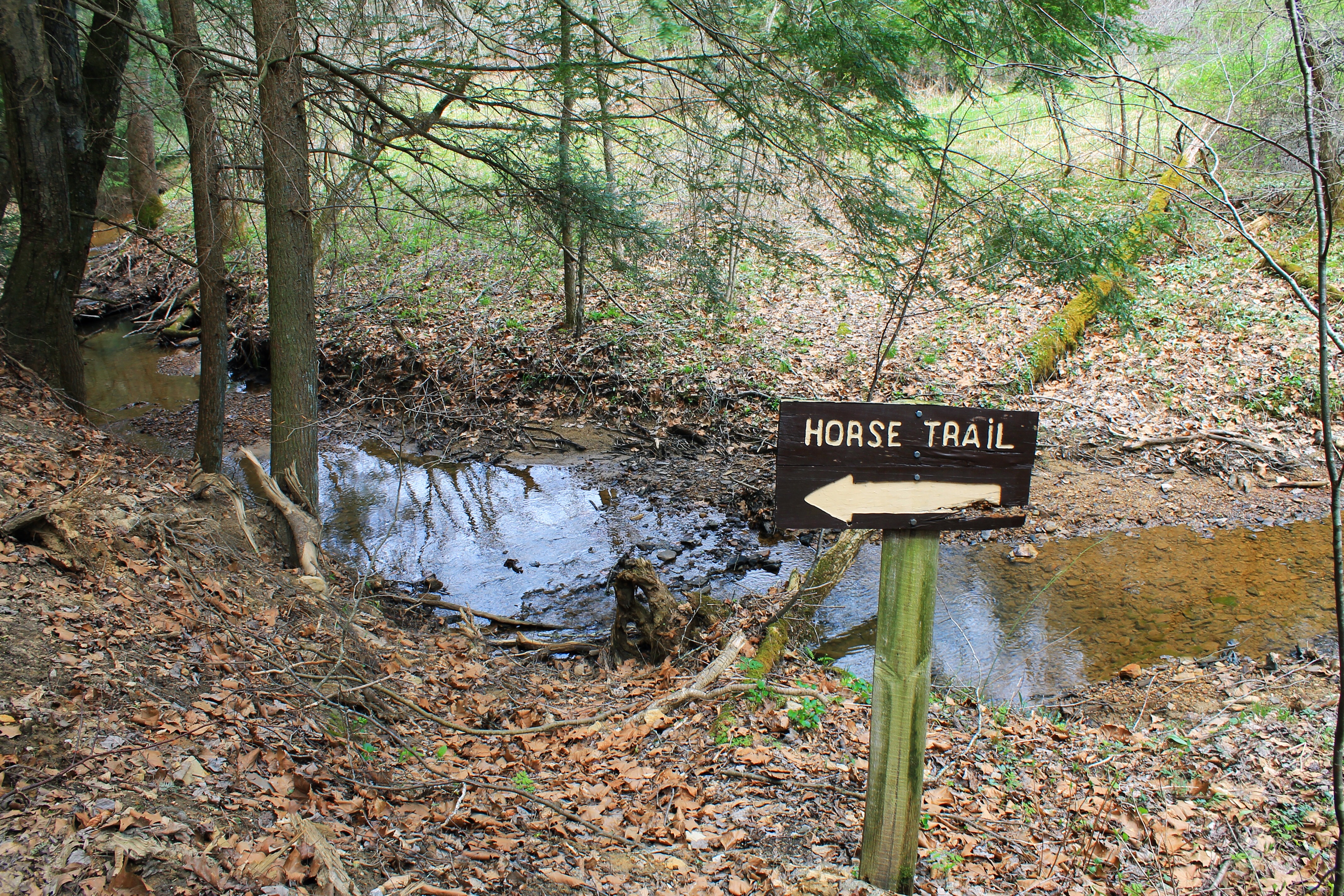 The trail head is at the back of the parking lot of the Rock Climbing and Rappelling Area. The trail winds it’s way through the forest blazed in white. Keep in mind that this trail is a bridle trail and can get muddy in places. While we were there, large equipment was bringing in rock to help cover up the muddy portions of the trail.