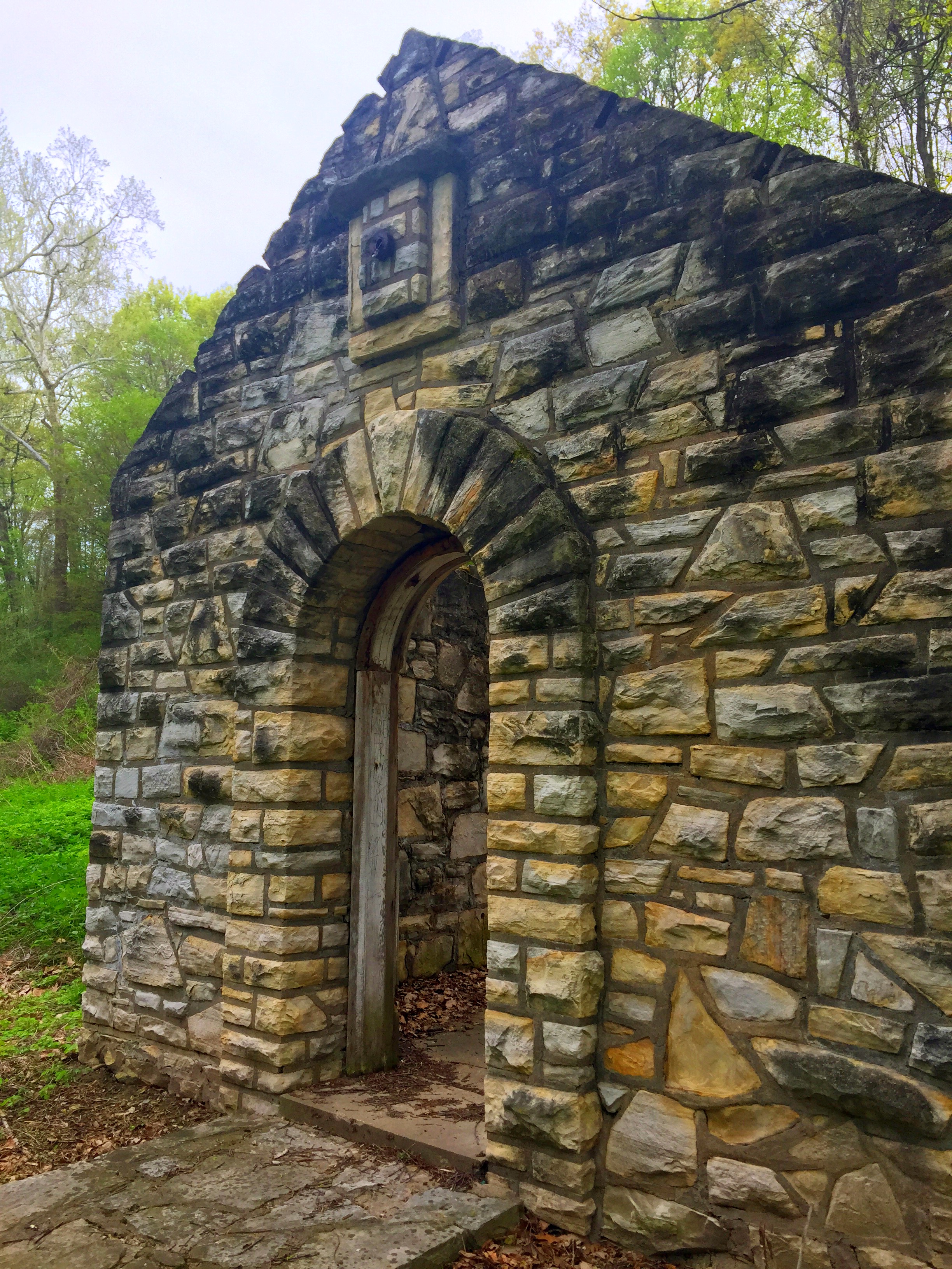 After looping your way partially around a small pond, there will be an informational sign on your left. The trail enters the woods here. There is a barricade in the path of trail to block motor vehicles, but just walk around it. After descending a small hill, there is a small stone building to the left with a nice view of Coldwater Creek as well.