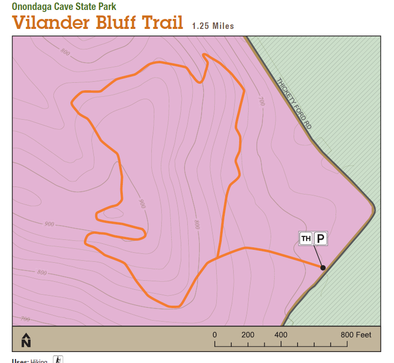 Vilander Bluff is about and hour and fifteen minutes southwest of St. Louis down Interstate 44. The natural area is within Onondaga Cave State Park and managed my the Missouri Department of Conservation.