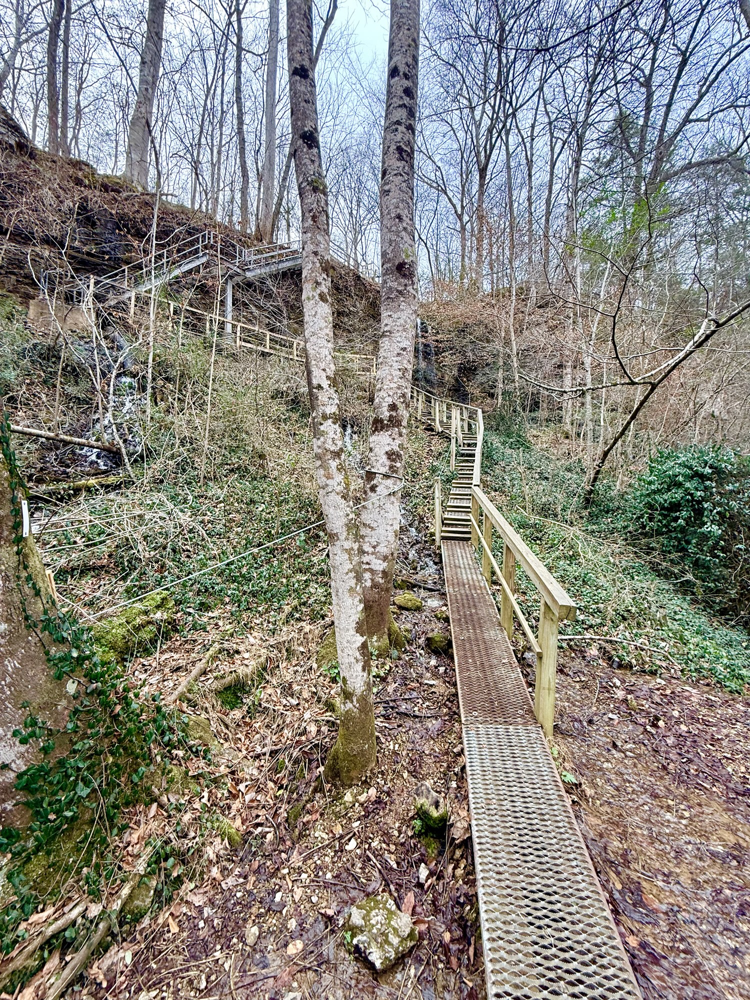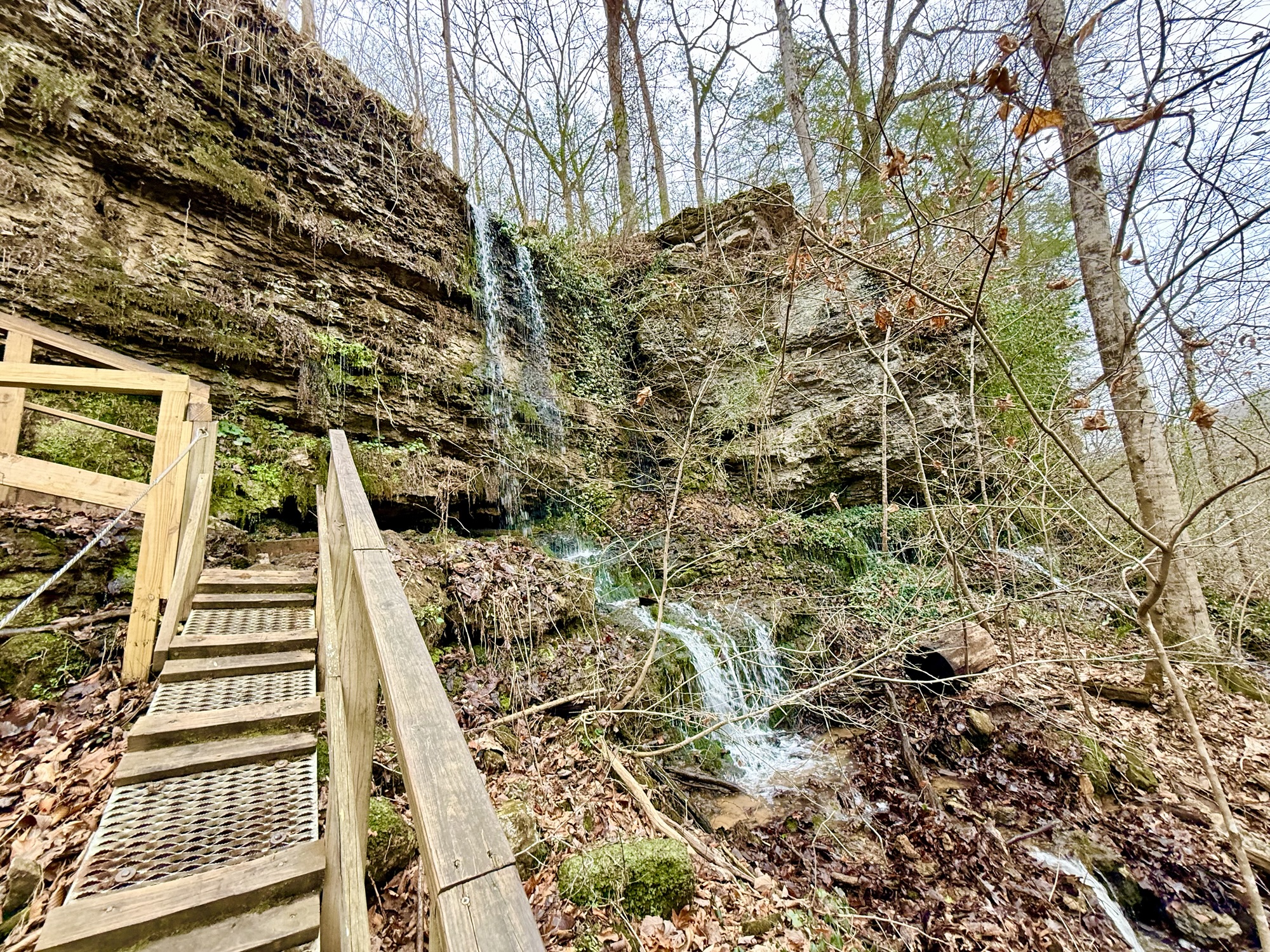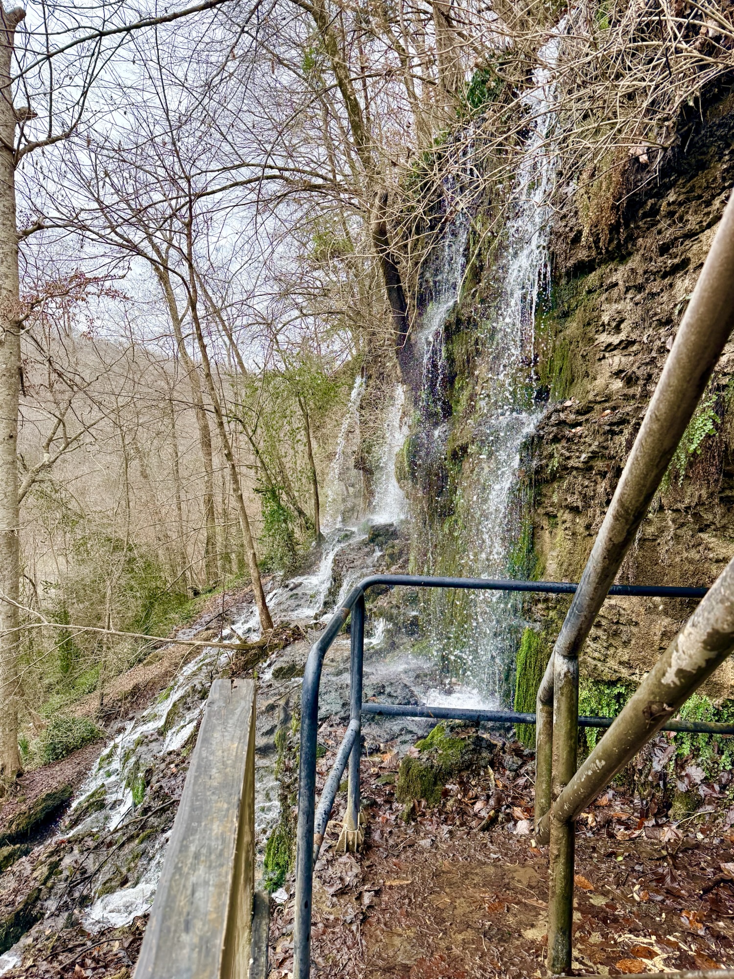 We made our way back to the parking lot by scrambling up some rocks beneath the large staircase. From here, we headed over to the south side of the state park. I wanted to show my brother the gorge, but it was extremely crowded and there was some sort of medical emergency going on so we headed for the Blue Hole trail. This was a trail that I had not previously hiked and from the description, it sounded like a trail we needed to hike! A set of wooden stairs leads down to a set of metal stairs. Underground caves create waterfalls that spill out of the side of the gorge. It almost looks like the waterfalls appear from nowhere!