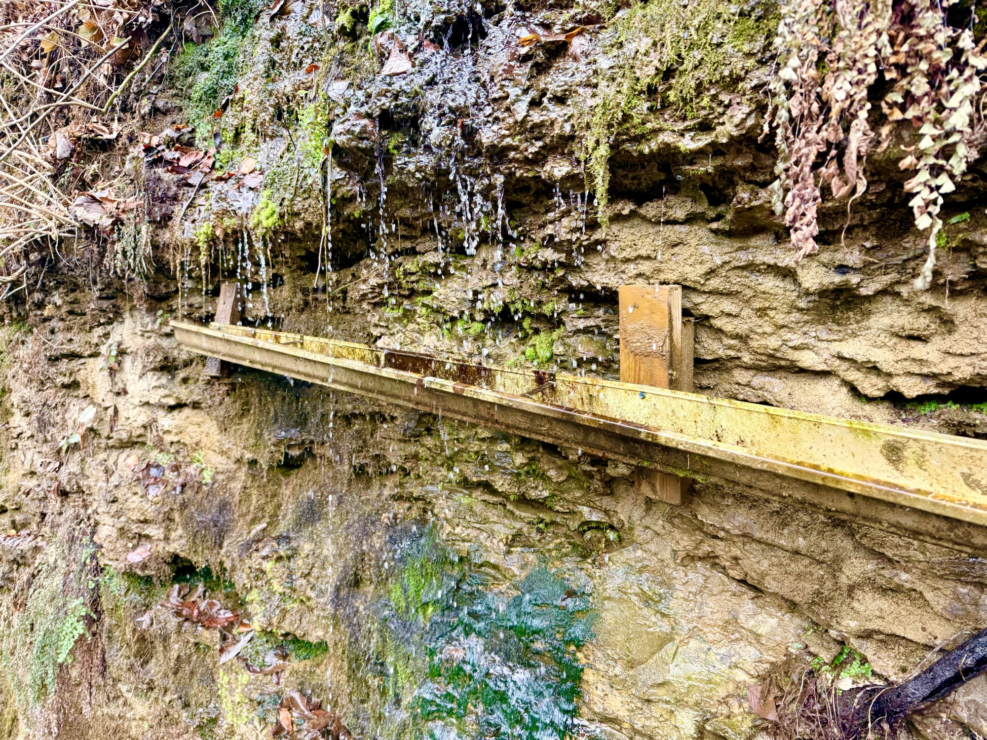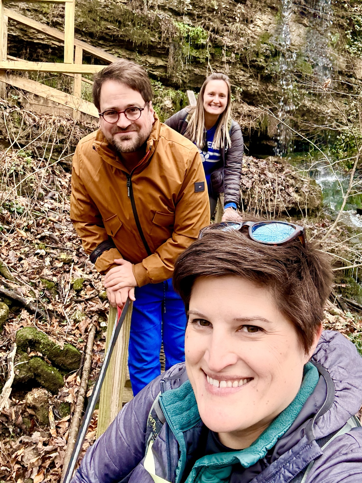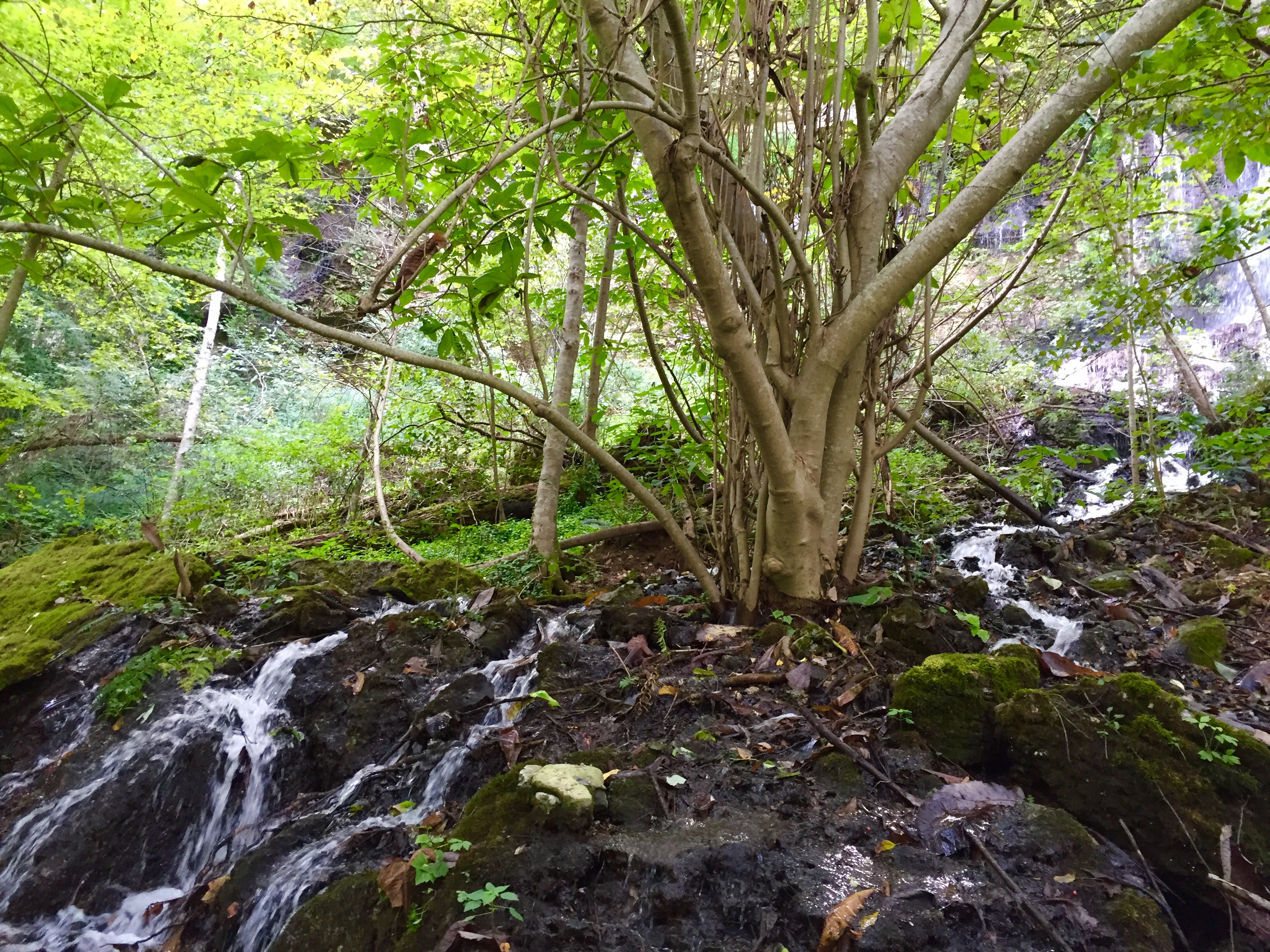 We made our way back to the parking lot by scrambling up some rocks beneath the large staircase. From here, we headed over to the south side of the state park. I wanted to show my brother the gorge, but it was extremely crowded and there was some sort of medical emergency going on so we headed for the Blue Hole trail. This was a trail that I had not previously hiked and from the description, it sounded like a trail we needed to hike! A set of wooden stairs leads down to a set of metal stairs. Underground caves create waterfalls that spill out of the side of the gorge. It almost looks like the waterfalls appear from nowhere!
