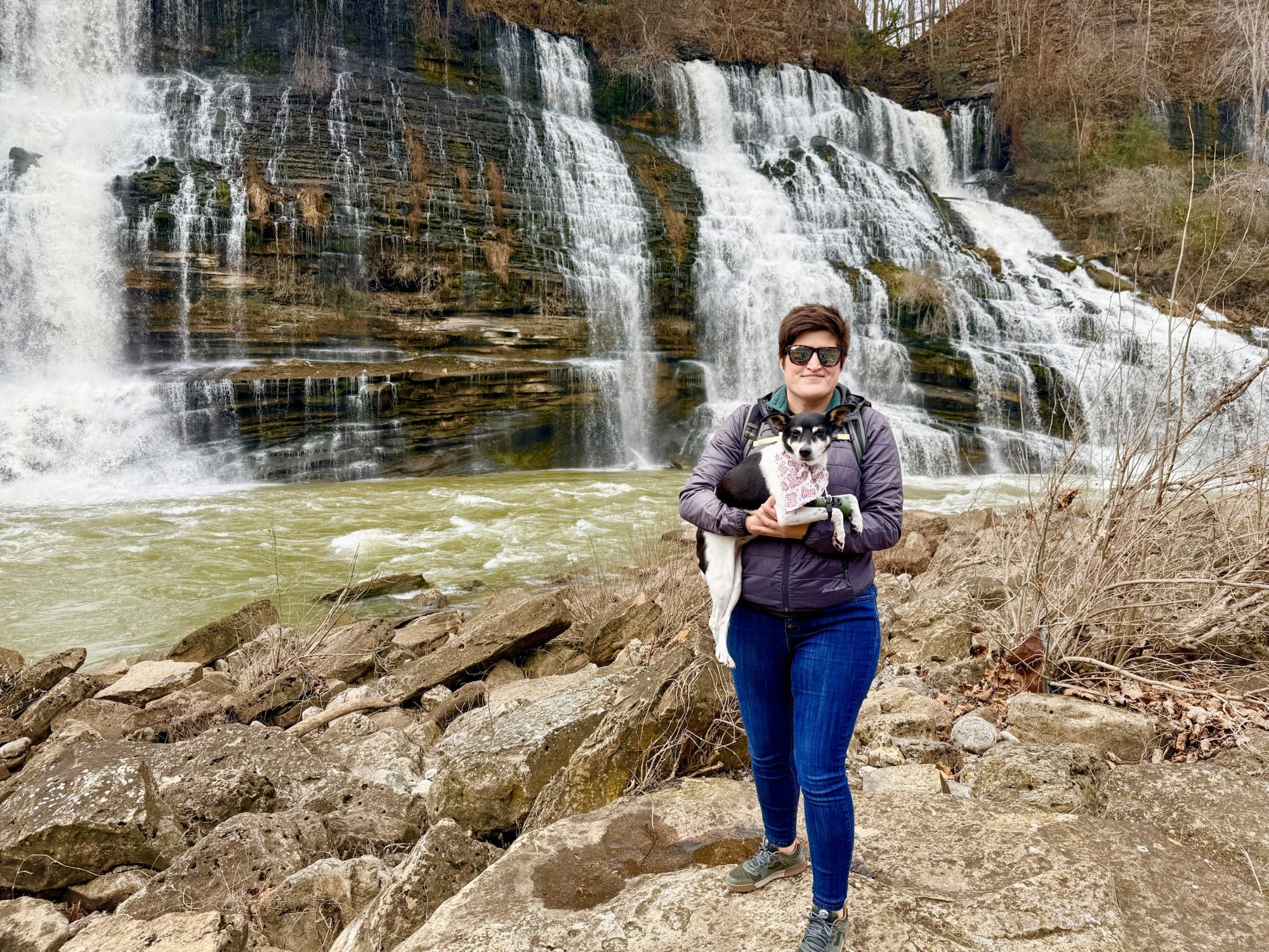 We saw a couple people walking around below the trail on the rocks that line the river so we headed down there. After some coaxing, my brother got me to sit on a large, flat rock right across from the waterfall. It takes your breath away! The sun was shining, I had my puppy in my lap and I could feel the mist from the waterfall. It really couldn’t get much better than that!