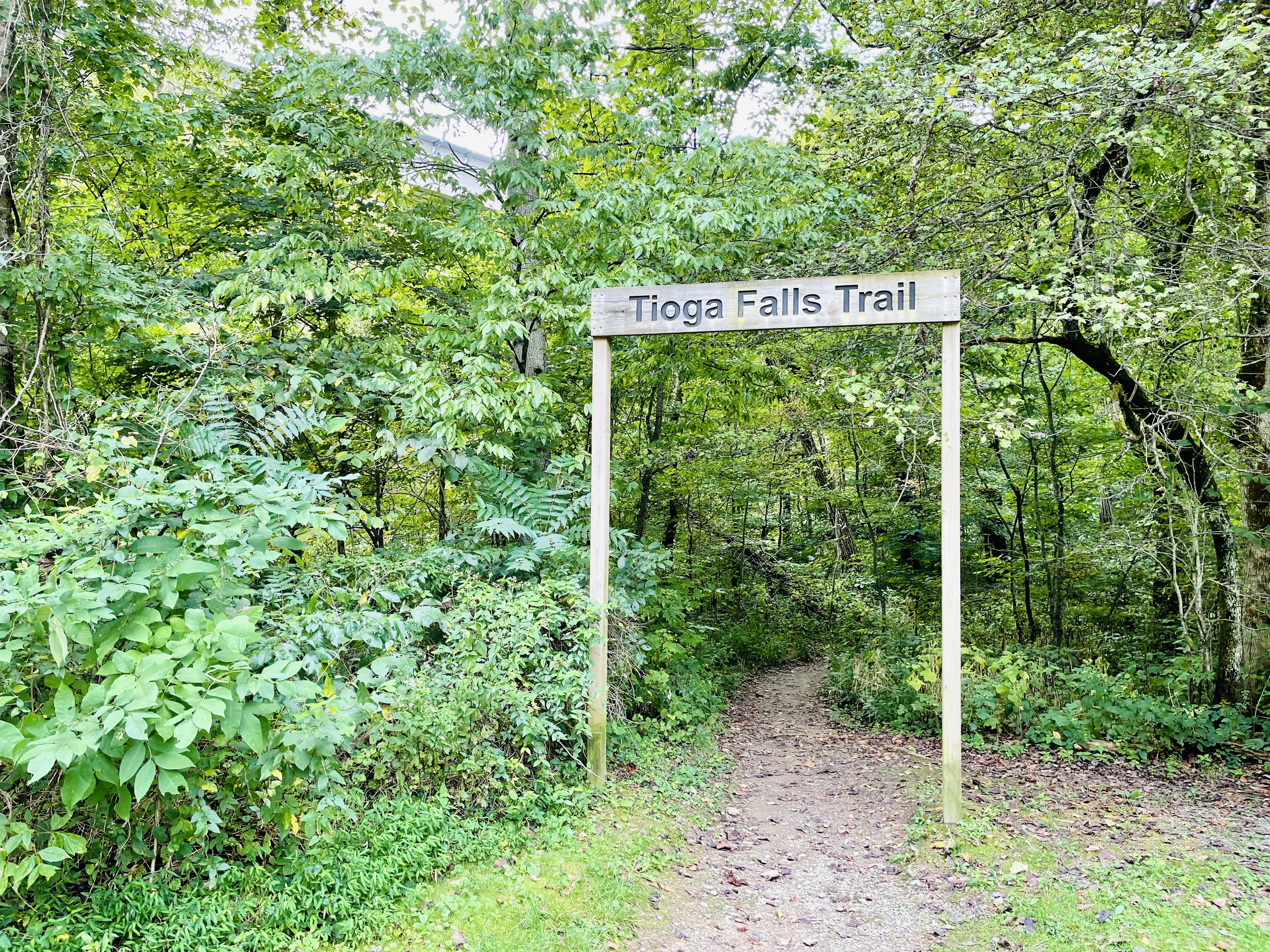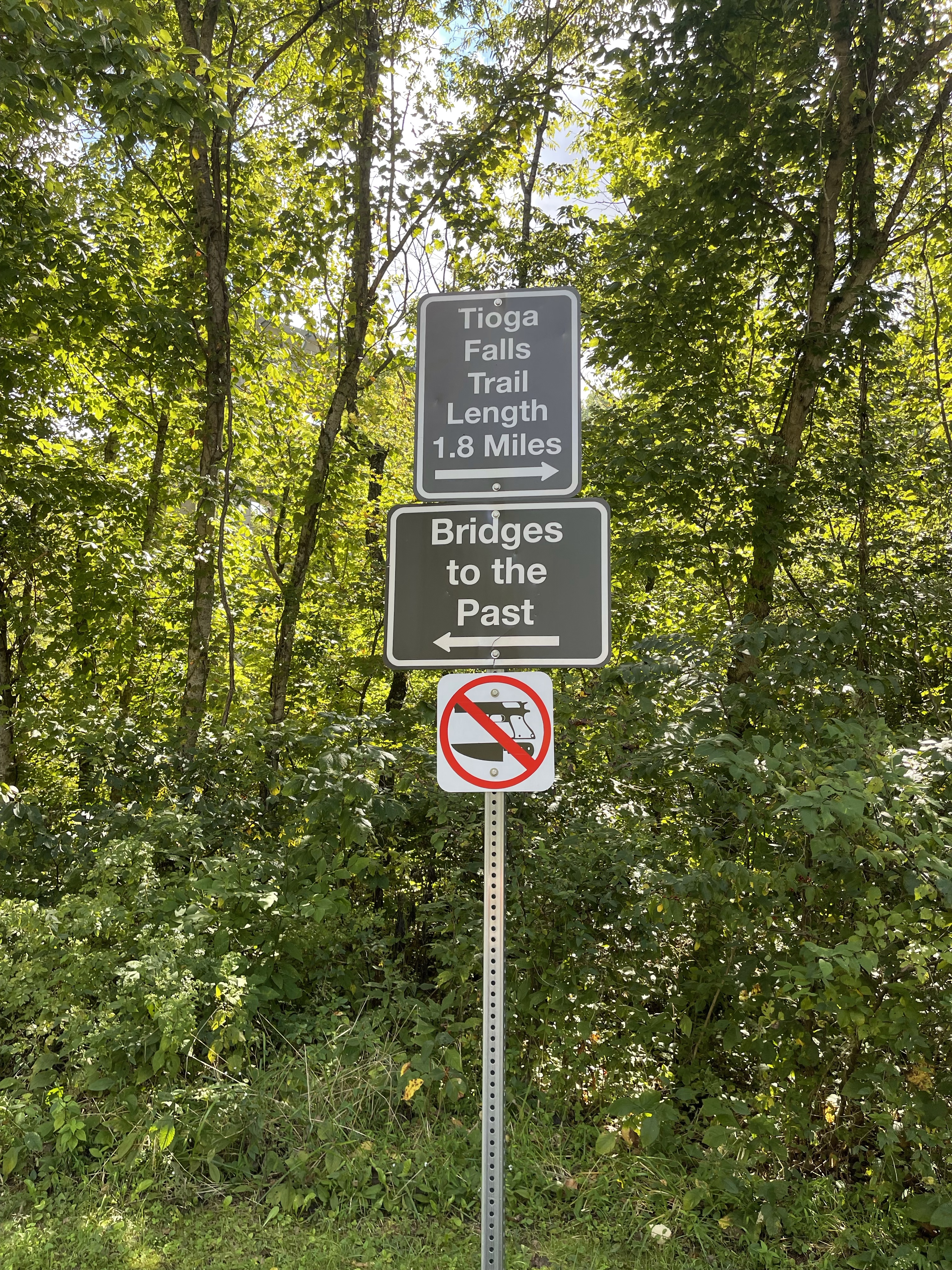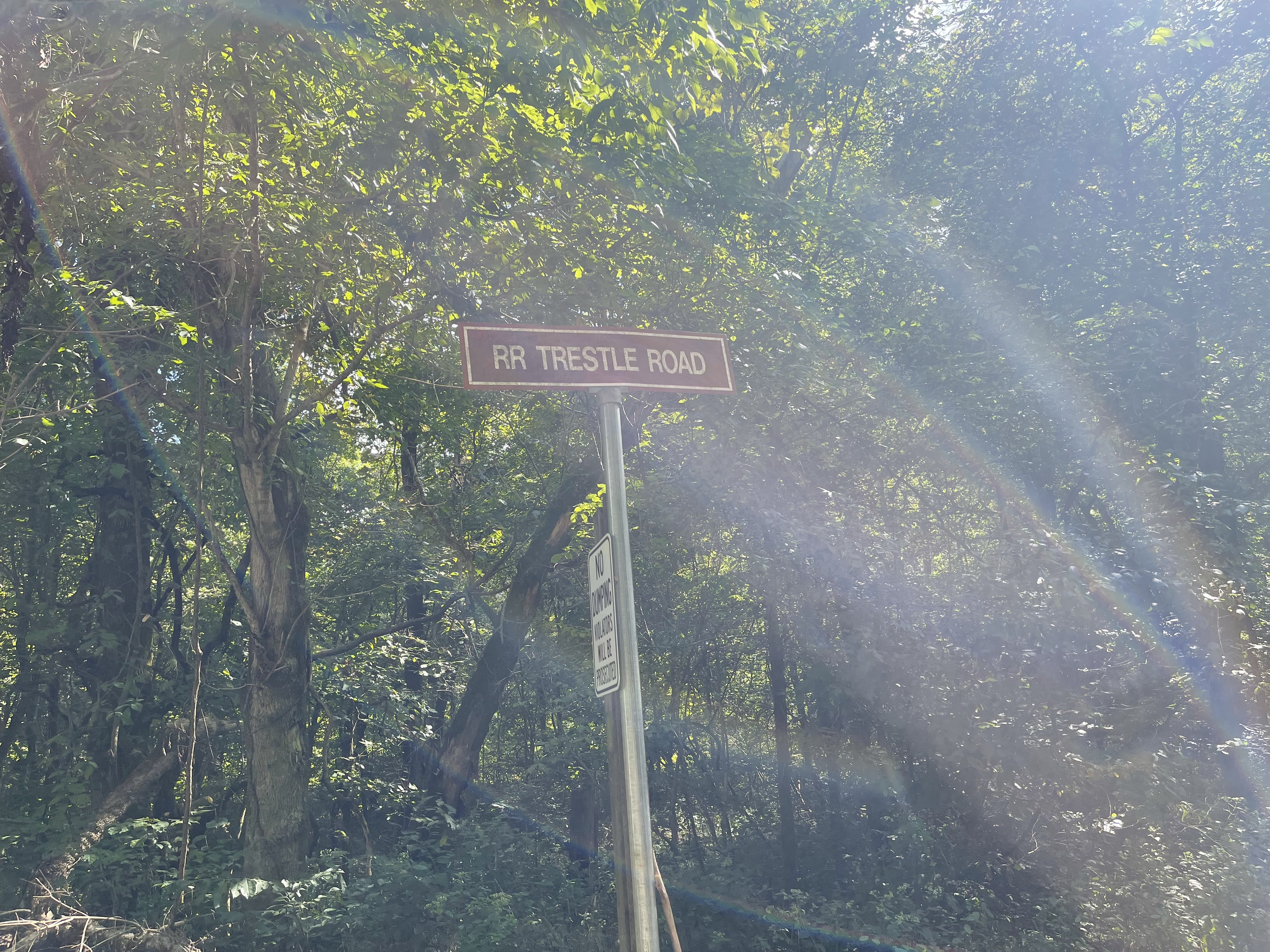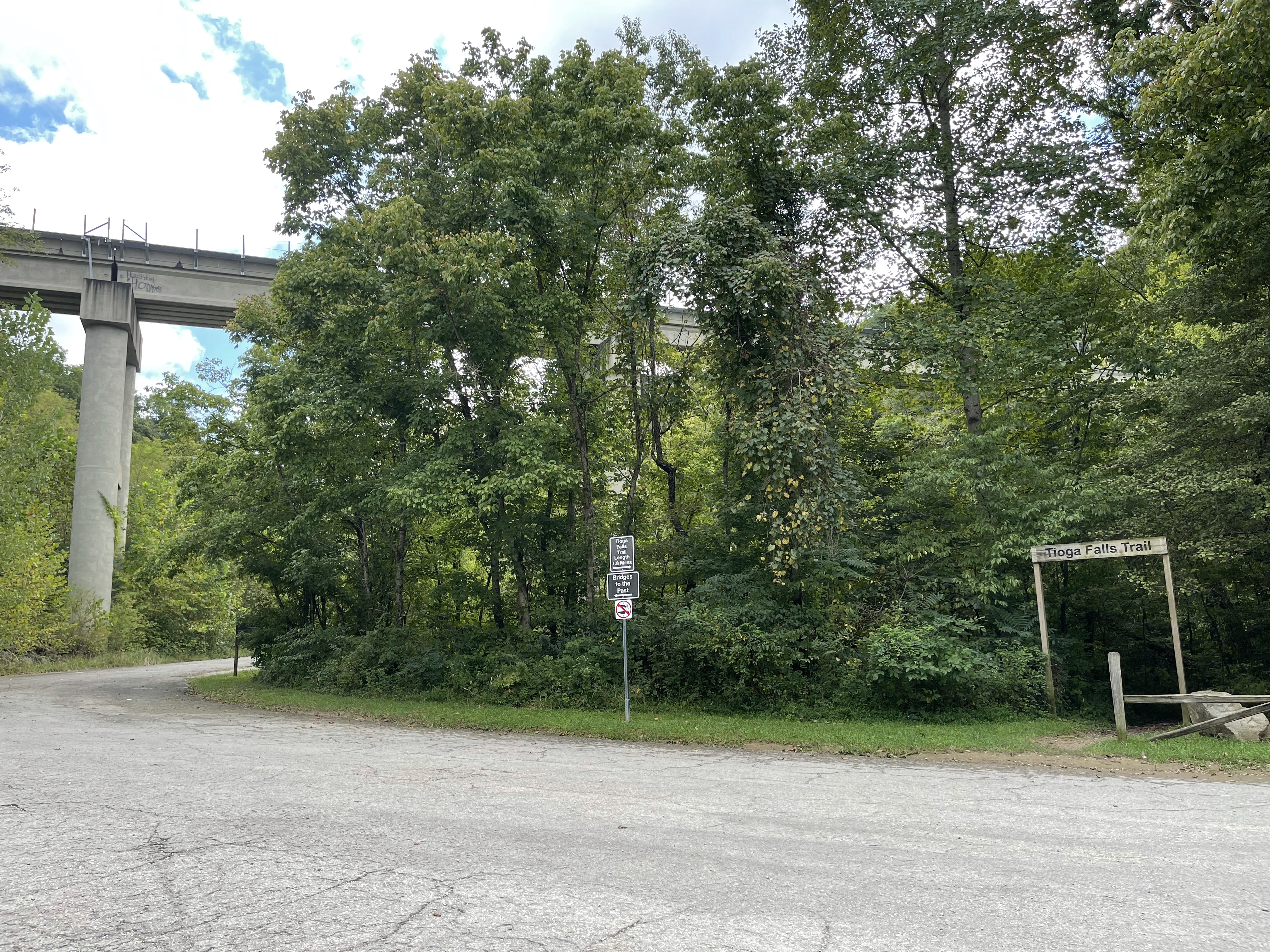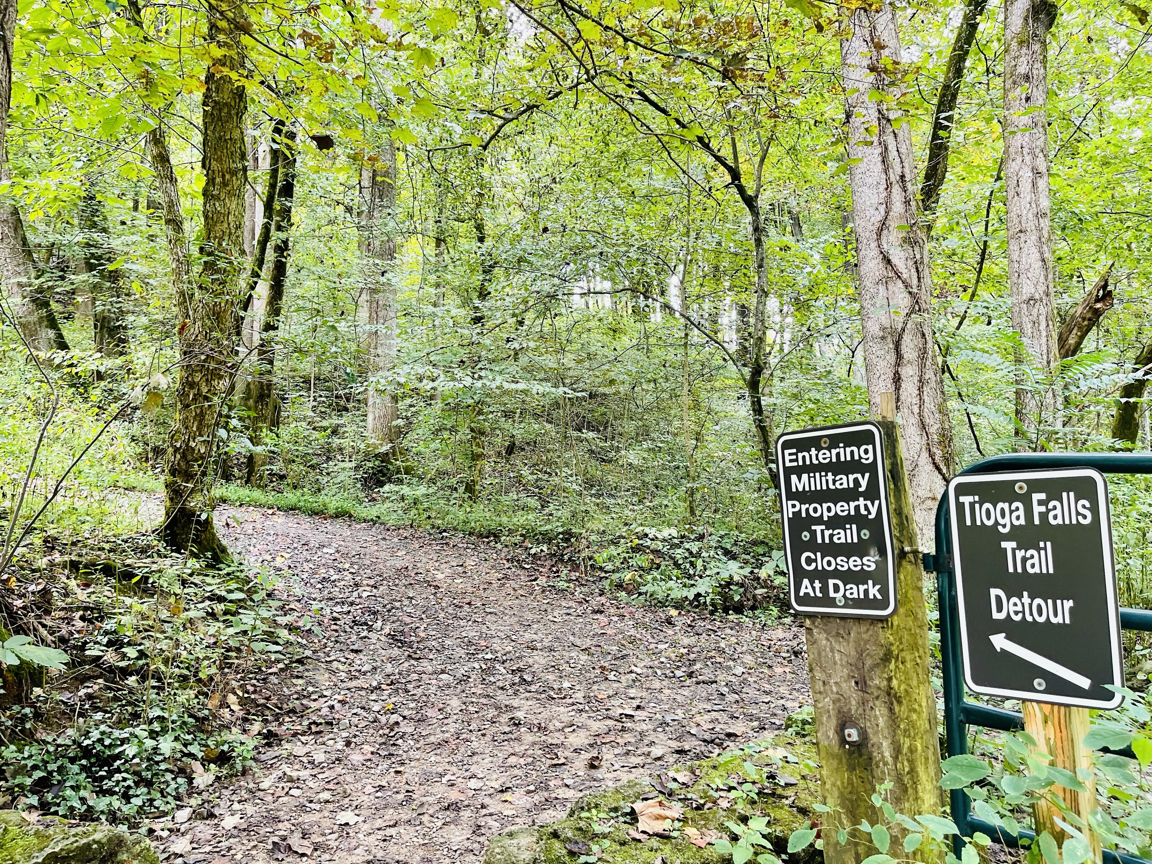 There is an entrance sign that signifies the start of the trail. The trail crosses over Tioga Creek and then a sign indicates a detour. The detour directs you to walk along Railway Trestle Road until you reach a gate. It seems a bit odd, but you are on the correct path =)