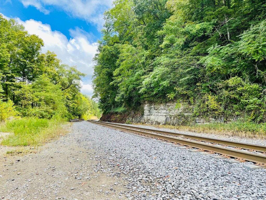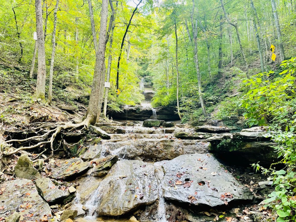 Tioga Falls is a 2 mile out and back trail located near Radcliff, Kentucky. This trail is about 35 minutes southwest of Louisville. If you are in the area, this trail is not to be missed. The signs lead to a parking lot below a train trestle. There is also another trail that starts from this area called ‘Bridges of the Past’, but we didn’t check it out.