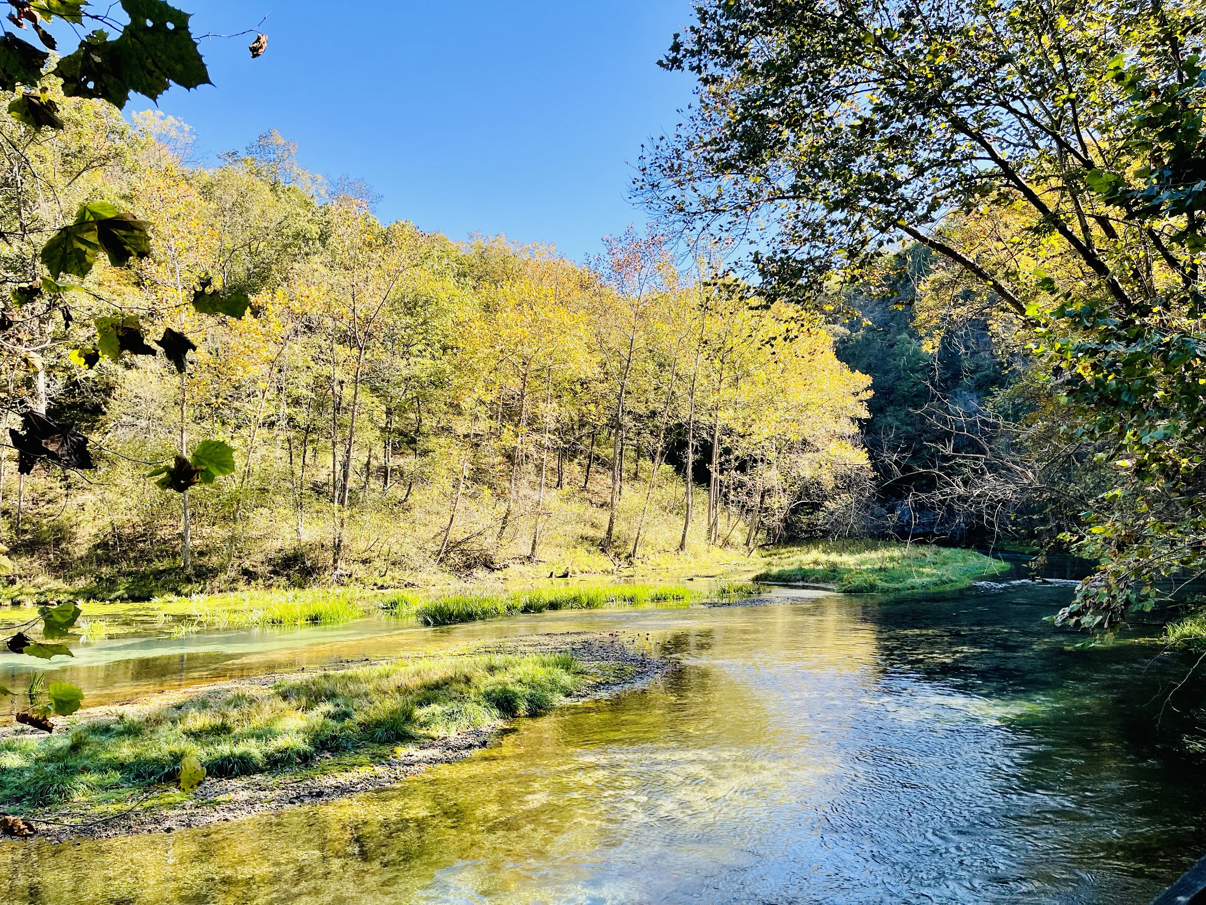 We crossed over onto the island where a grist mill used to stand long ago. If you hike one trail in the park, the Island Trail is not to be missed. You will want to head to the opposite side of the island and look for a trail that leads down and along the spring-fed creek.