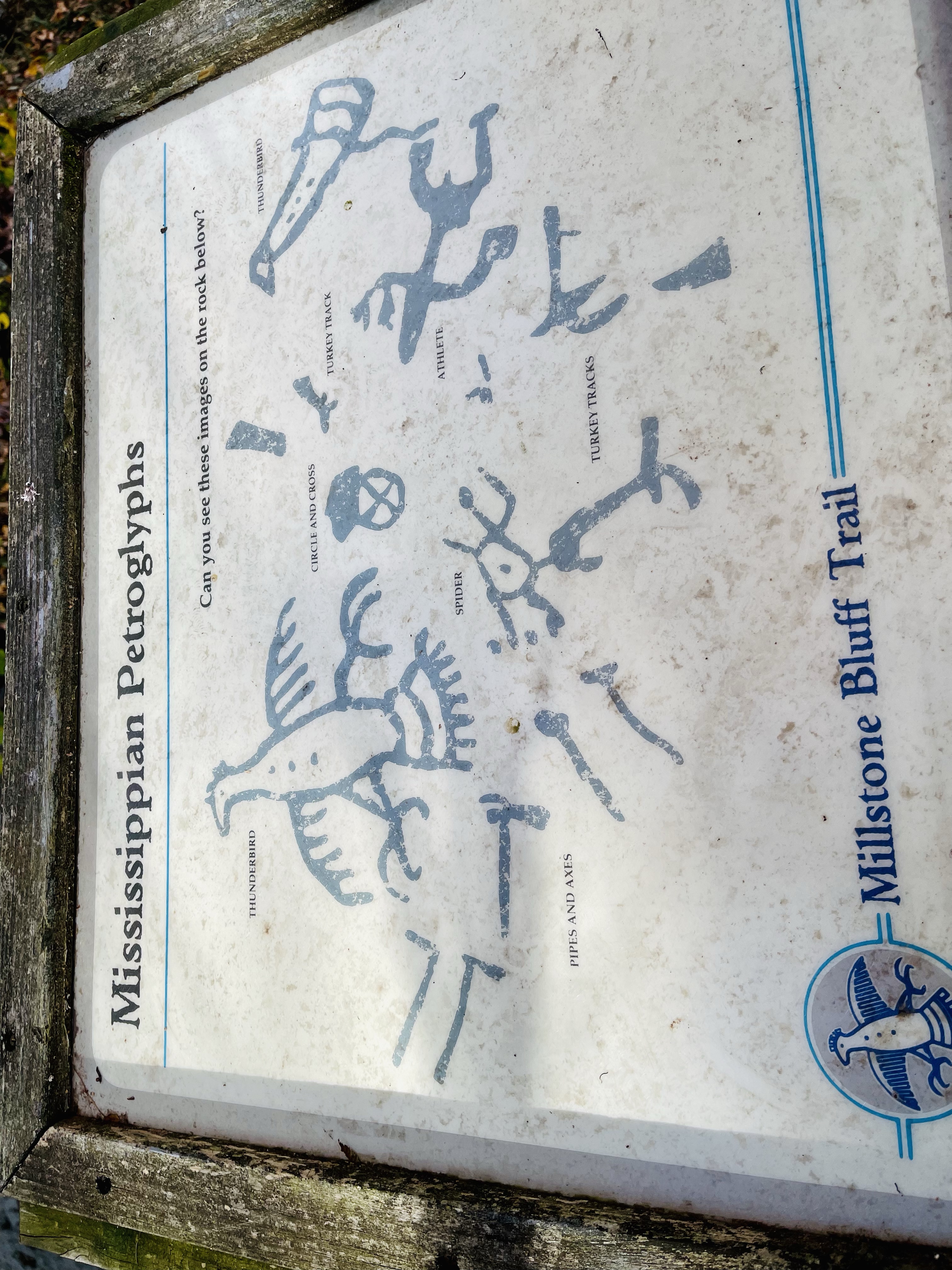 The most notable feature of Millstone Bluff is the ancient rock art. On the northwest side, a short trail leads to an area of large sandstone bluffs and on the top of one, several petroglyphs are visible. Do you see the falcon-like bird below?