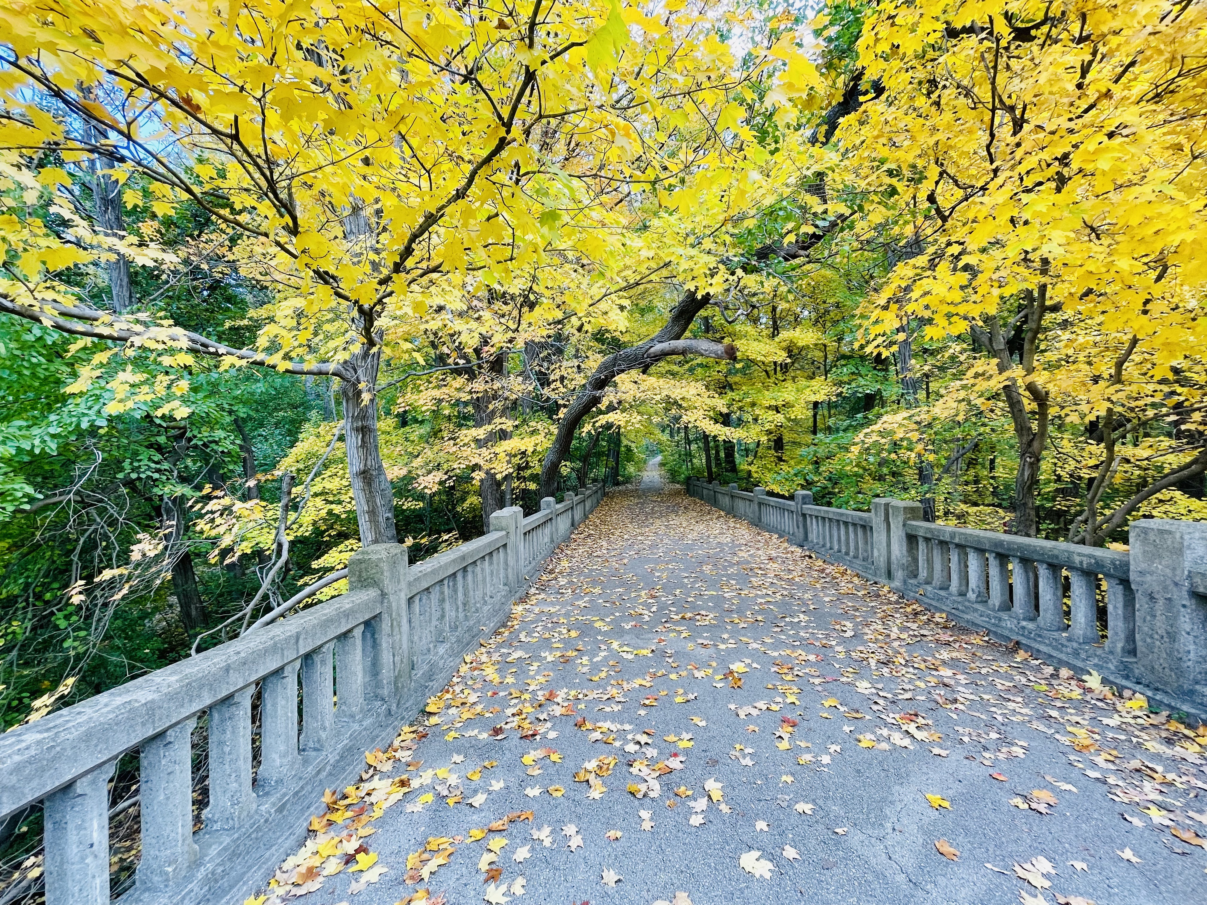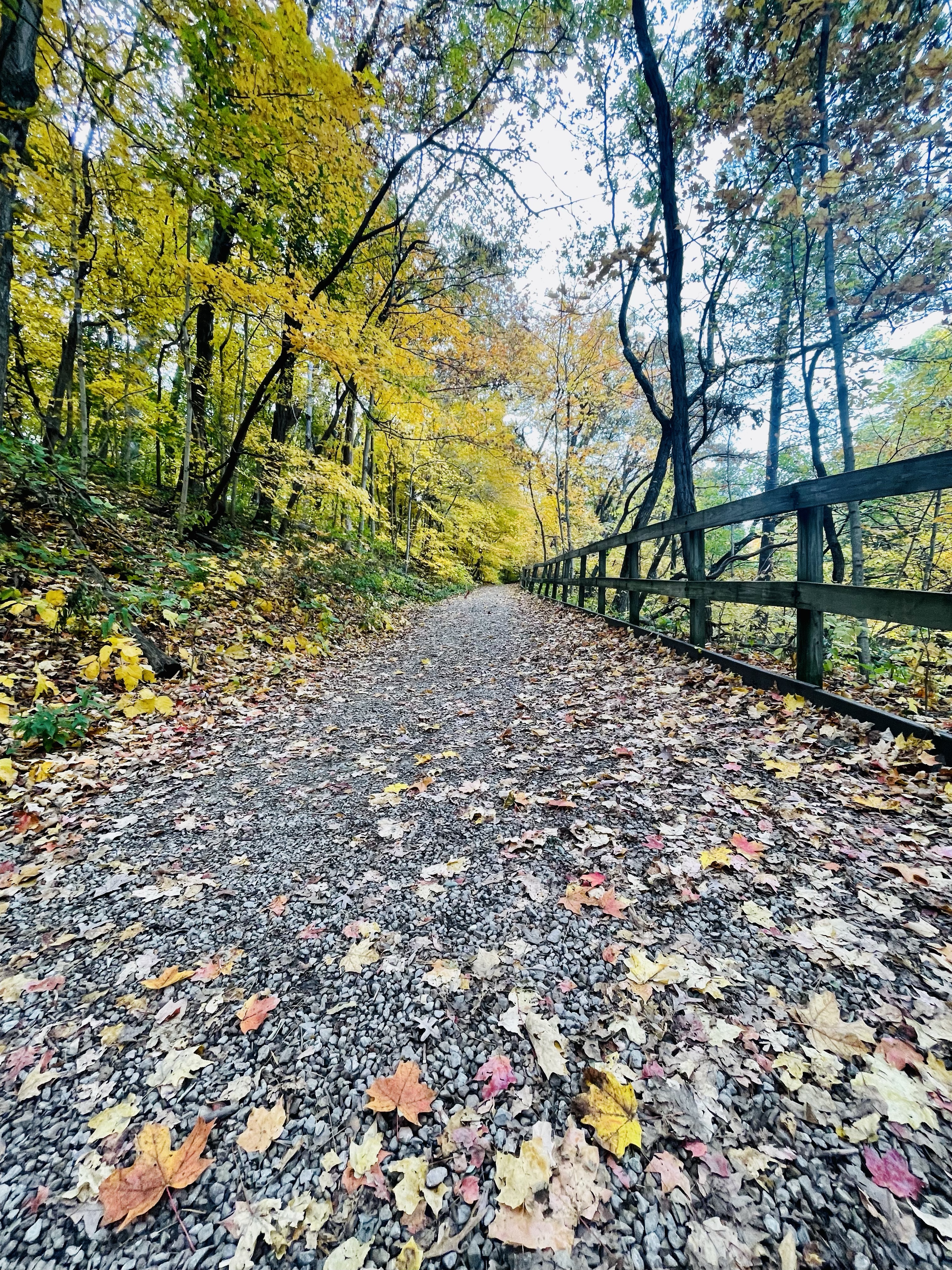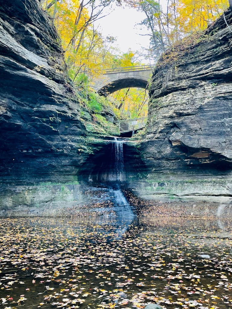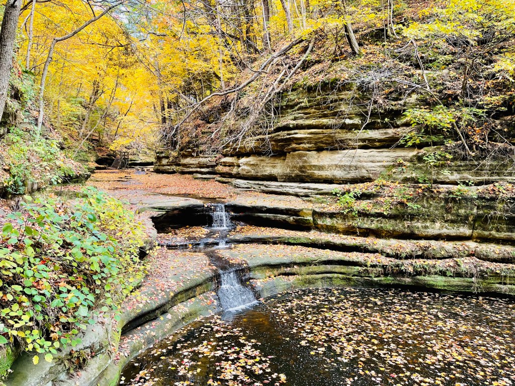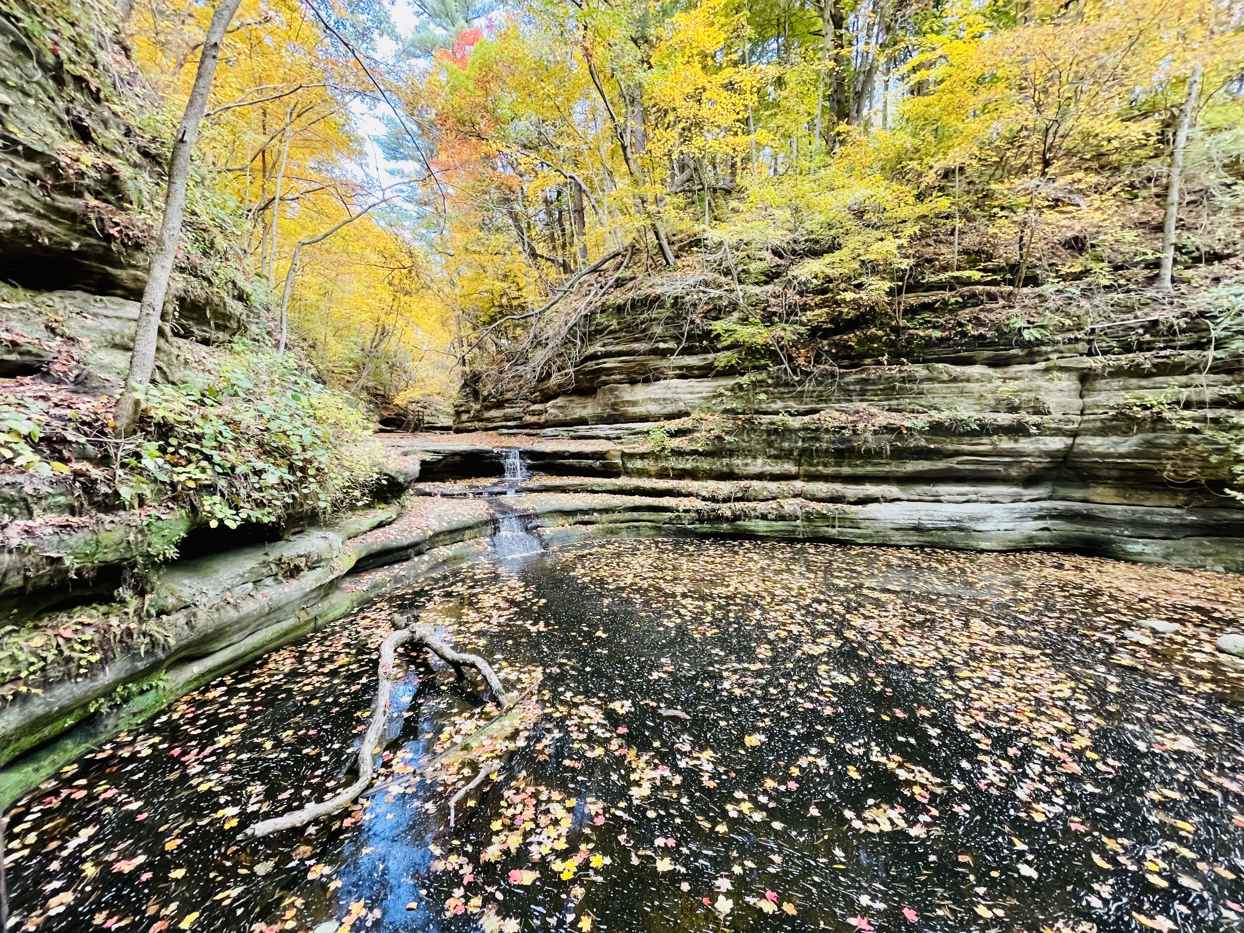 We first hiked the Bluff Trail along the east side of the Lower Dells and then descended into the canyon using the staircase at the south end. The trail winds up the canyon and eventually ends at a breathtaking waterfall. We had the place to ourselves and watched the golden leaves float down from above.