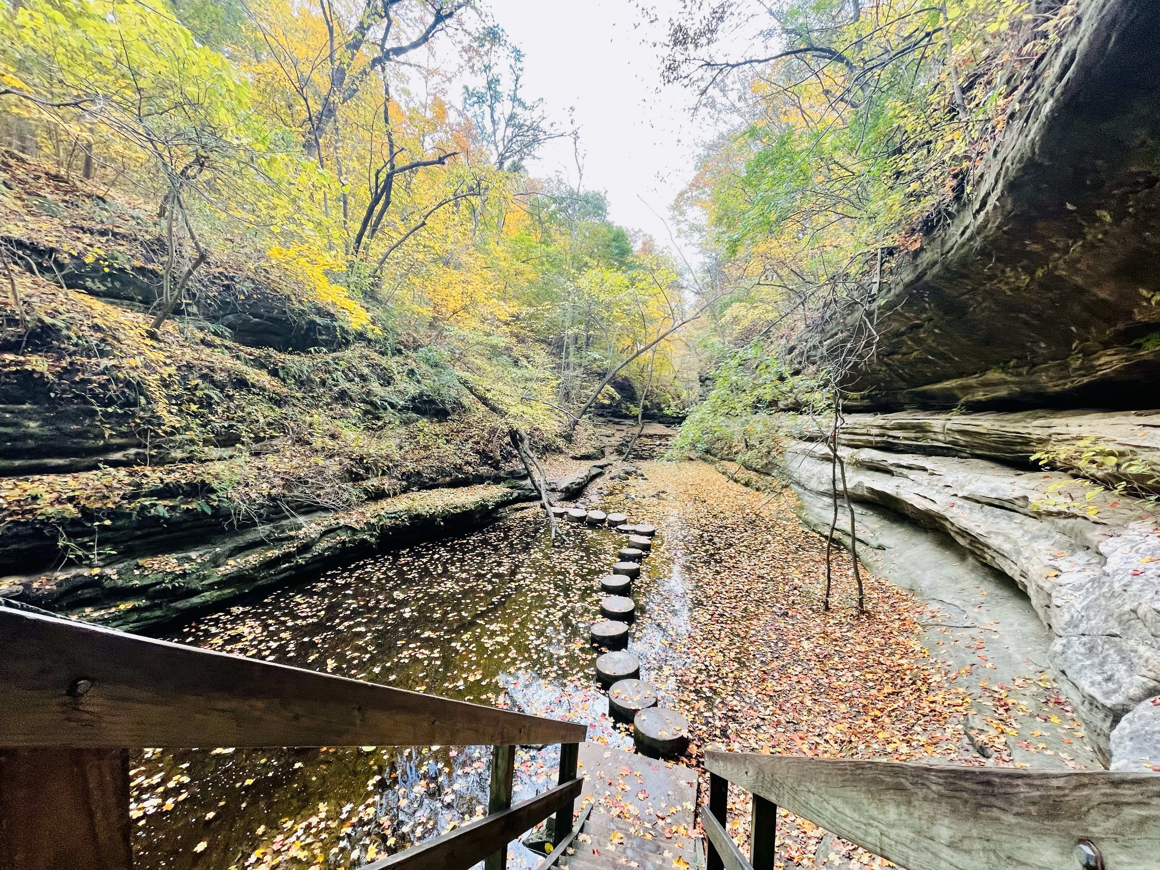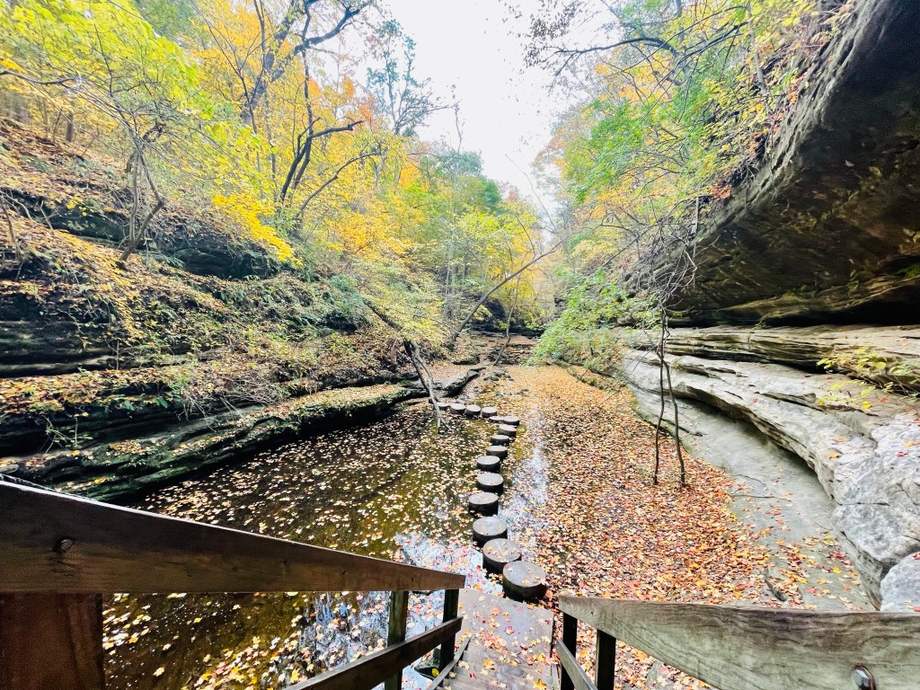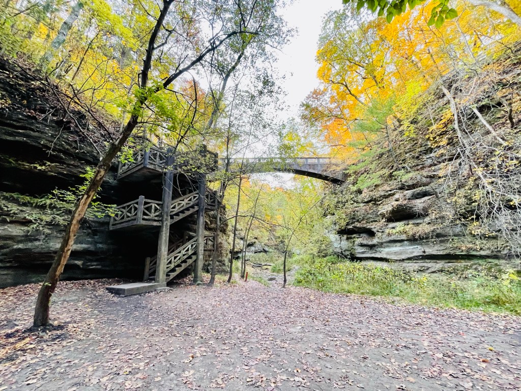 Matthiessen State Park boasts a long, narrow canyon with a stream that has carved unique rock features over the years. From the parking lot, you first pass by a re-creation of a French fort that was found throughout the Midwest. A set of stairs leads down to the top of the canyon where a bridge spans the upper and lower dells.