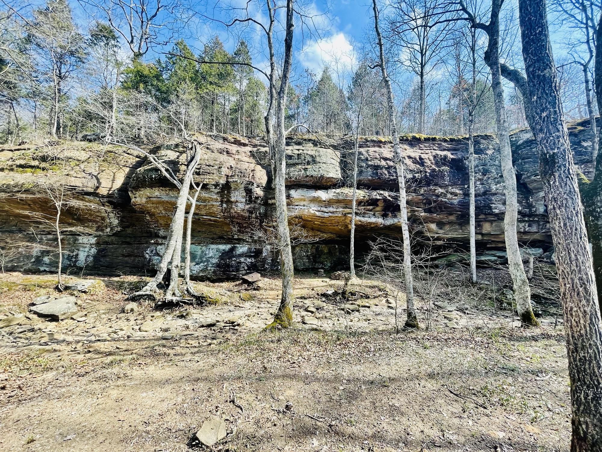 This trail is actually part of the Lusk Creek Wilderness. The trail heads down into the forest and descends into a hollow. The bluffs start to rise on either side of you.