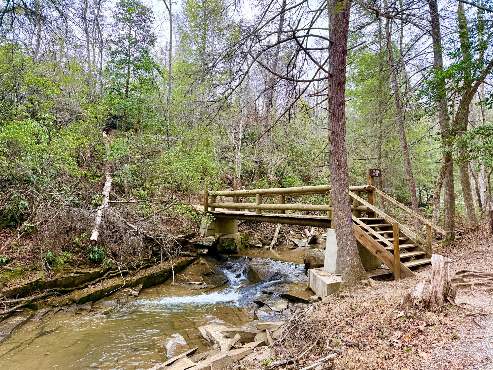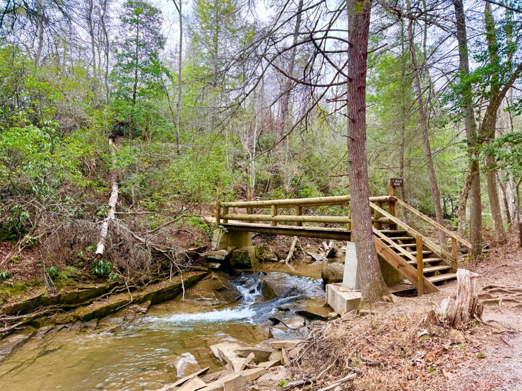 After crossing the bridge, the Woodland Trail climbs a set of stairs. After a short distance, the Overlook Trail spurs off to the right. The best part of this trail is the first overlook which gives you a view of Cane Creek Falls and Rockhouse Falls from a different angle! So majestic!