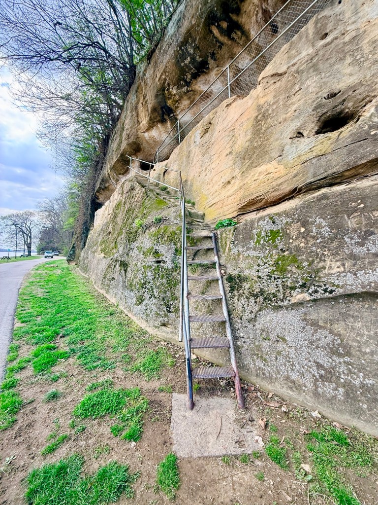 A set up metal stairs that then turns to stairs cut into the side of the rock lead up into a long cave.